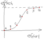 この表上の結果は、見た目ほぼ単純に斜めに推移していっていますが、2d6振りによって適用されるために、その実質はロジスティック曲線、しかも修正値の重みの大きい地獄仕様のロジスティック曲線となっています。この地獄仕様というのは、昨日と一昨日とに触れた話で、2d6ゆえに修正値+1の重みがきつく、かつ閾値を持って効いてくるということです。